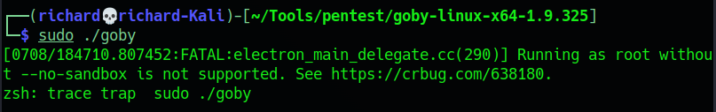 1 | [0708/184710.807452:FATAL:electron_main_delegate.cc(290)] Running as root without --no-sandbox is not supported. See https://crbug.com/638180. |