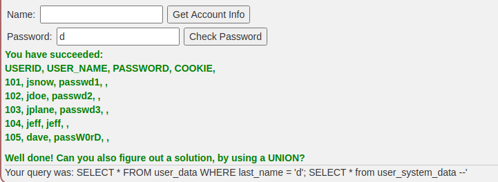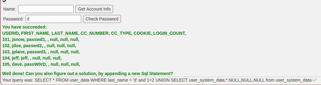 d' and 1=2 UNION SELECT user_system_data.*,NULL,NULL,NULL from user_system_data --