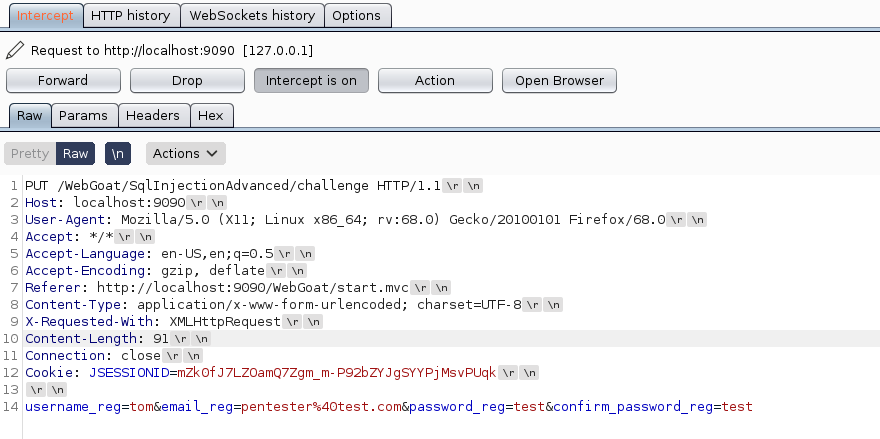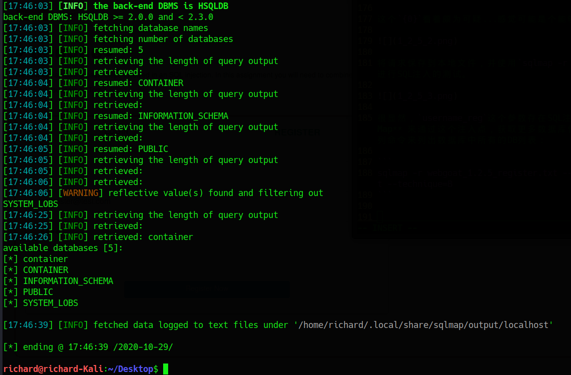 将请求保存到本地文件,并使用sqlmap -r webgoat_1.2.5_register.txt对这个请求进行SQL注入的测试。