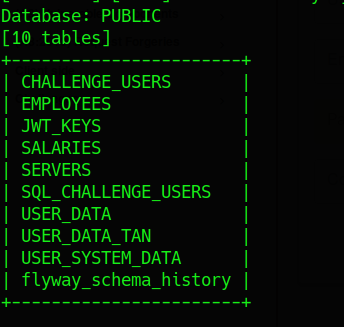 我们获取到了5个数据库。再指定数据库为PUBLIC获取该数据中所有的表名。同时我们注意到,这个时候执行的速度明显减慢了很多,所以我们可以在参数中加入--string="already exists please try to register with a different username"指定查询为真的条件。